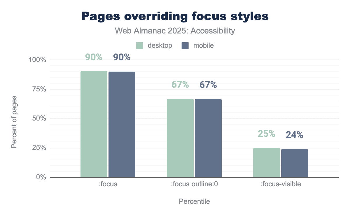 In 2025, 67% of sites explicitly removed default focus outlines, up 14% from 2024. This concerning trend may impair accessibility if not replaced with effective styles. On the positive side, adoption of the :focus-visible pseudo-class has grown. This means developers are starting to create context-aware focus indicators that are visible only when necessary.