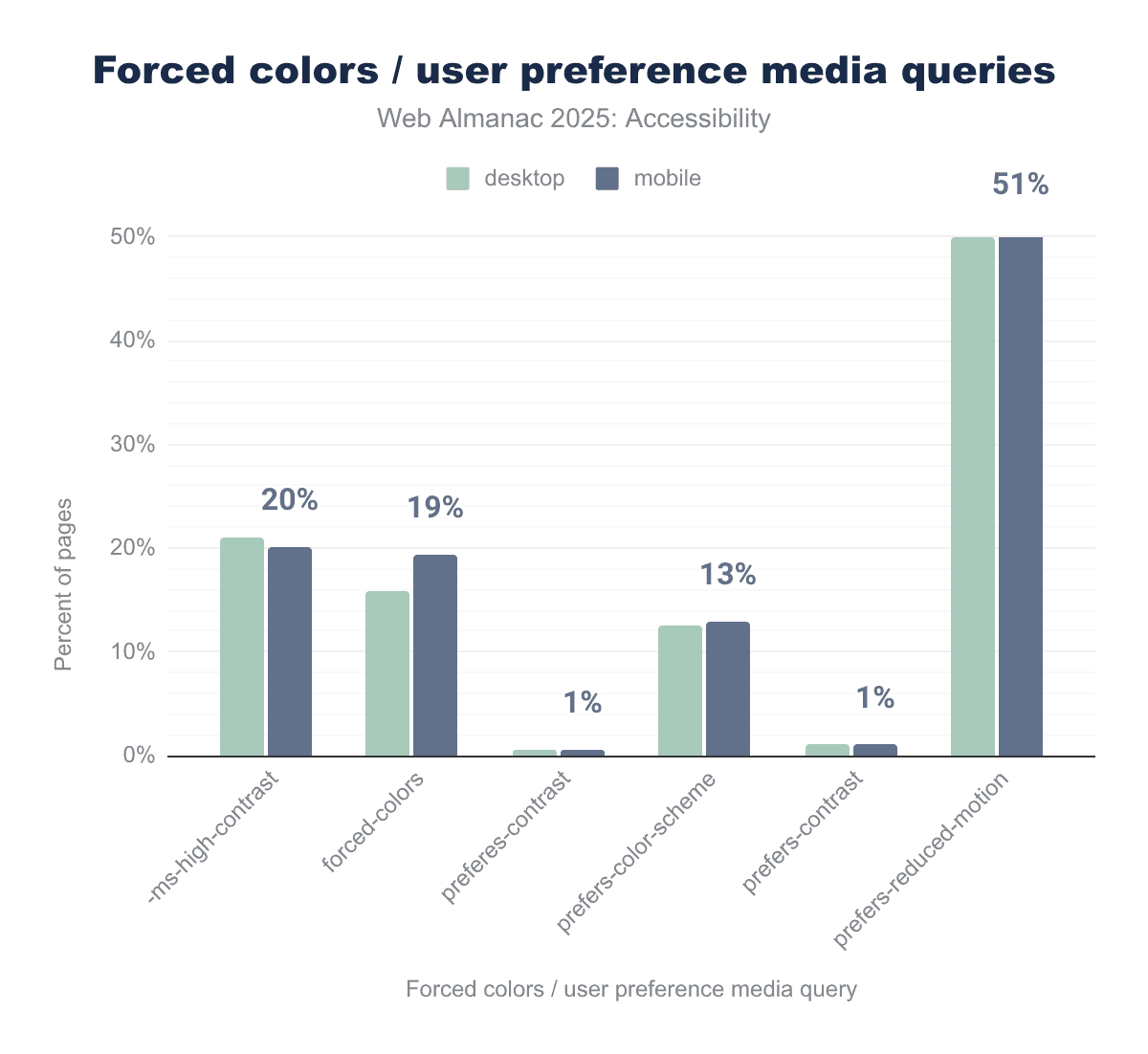 The most familiar queries, prefers-reduced-motion and prefers-color-scheme, remain widely supported by browsers. In 2025, adoption of these queries by websites shows little change. However, the use of forced-colors, which supports high-contrast modes for users with low vision, increased by 5% to 19%. Meanwhile, use of the outdated -ms-high-contrast media query has declined by 3% down to 20%. This reflects a gradual shift towards modern CSS standards.