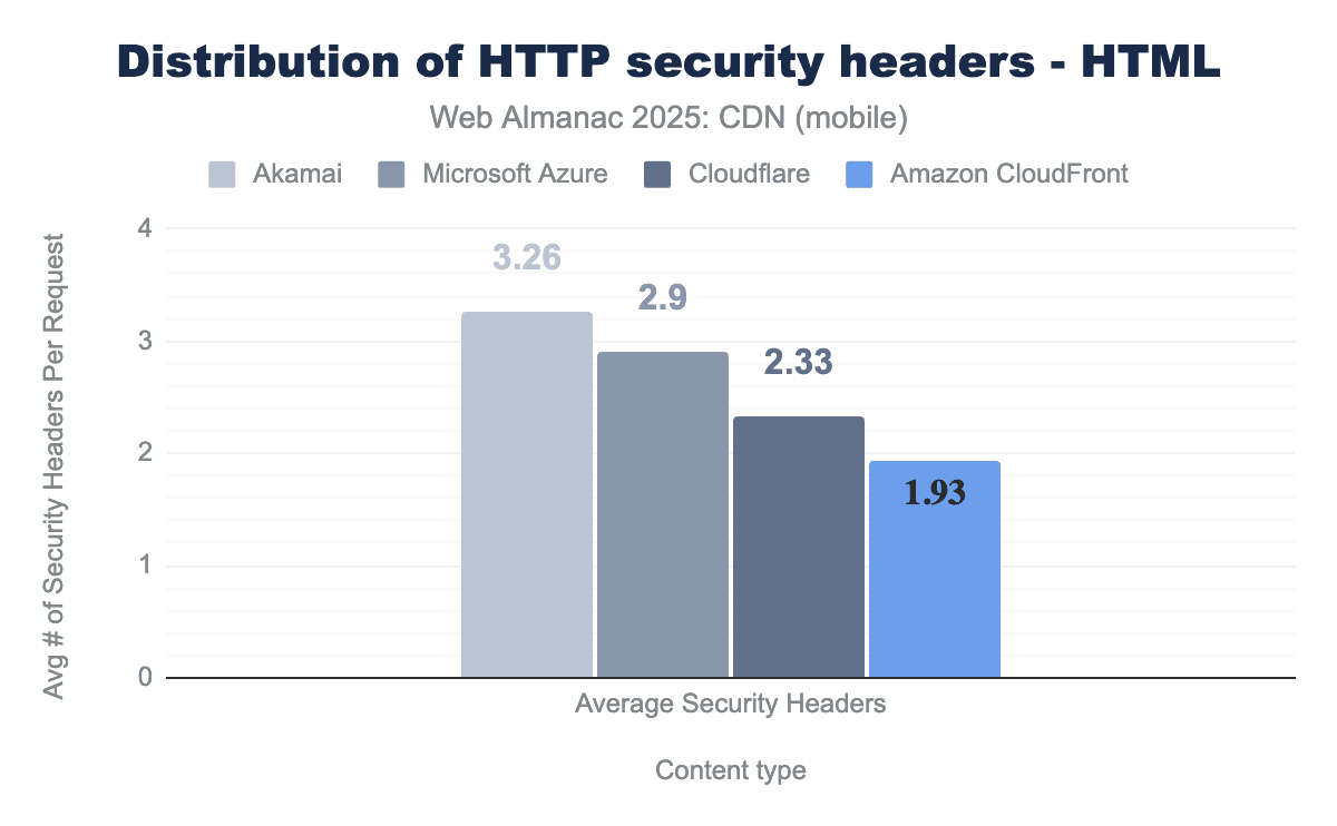 Both Cloudflare and Amazon CloudFront have a lower average number of security headers and this trend continues as we go more granular into specific headers as seen below. Header count is not a direct proxy for security posture; it often reflects how much a CDN auto-injects vs requires explicit configuration.