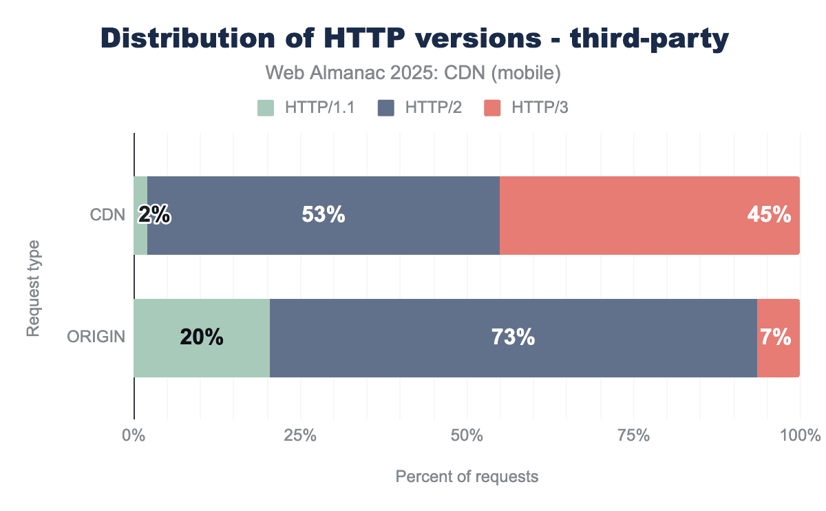 - Protocol Leadership: CDNs show 29-45% HTTP/3 adoption versus <7% for origins