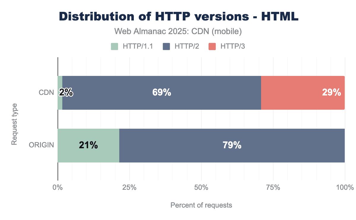 Within our dataset, the data reinforces the role CDNs play in driving the adoption of new protocols among popular websites and static resources. CDNs saw 29% traffic from HTTP/3 with effectively 0% for origin traffic. Compared to 2024, we observed a sharp decrease in CDN usage for HTTP/1.1 in 2025.