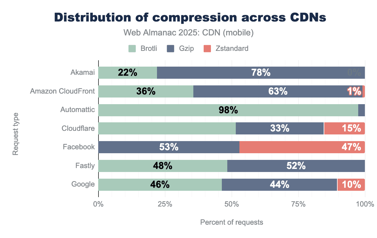 - Compression Innovation: Leaders like Automattic achieve 97.5% Brotli adoption, with Zstandard growing from 3% to 12% year-over-year